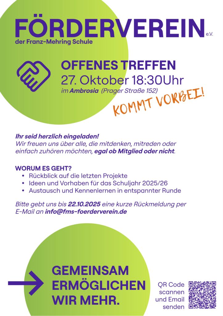 Der Förderverein der Franz-Mehring-Schule lädt am 21. Oktober um 18:30 Uhr zu einem offenen Treffen im Restaurant Ambrosia auf der Prager Straße 152 ein. Eingeladen sind alle, die sich für das Schulleben interessieren, mitgestalten oder einfach mehr über die Arbeit des Vereins erfahren möchten – unabhängig davon, ob sie bereits Mitglied sind oder nicht.